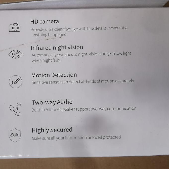 Productbeschrijving: De camera heeft een 2 wegen audio functie, je kan dus horen wat er gebeurd maar ook spreken tegen bijvoorbeeld de pakketbezorger. De camera beschikt over 2 miljoen pixels 1080P high-definition beeldkwaliteit; Infrarood nachtzichtfunctie, wit licht vullicht; draai 355 graden naar links en rechts, 90 graden op en neer; geluid, video, afspelen, alarm en andere functies; Kan aan de muur worden gehangen of op tafel worden geplaatst; USB-power Android-interface, 5V 1.5A voeding; maximale ondersteuning 256G kaart opslag; ondersteuning van cloudopslagdiensten;