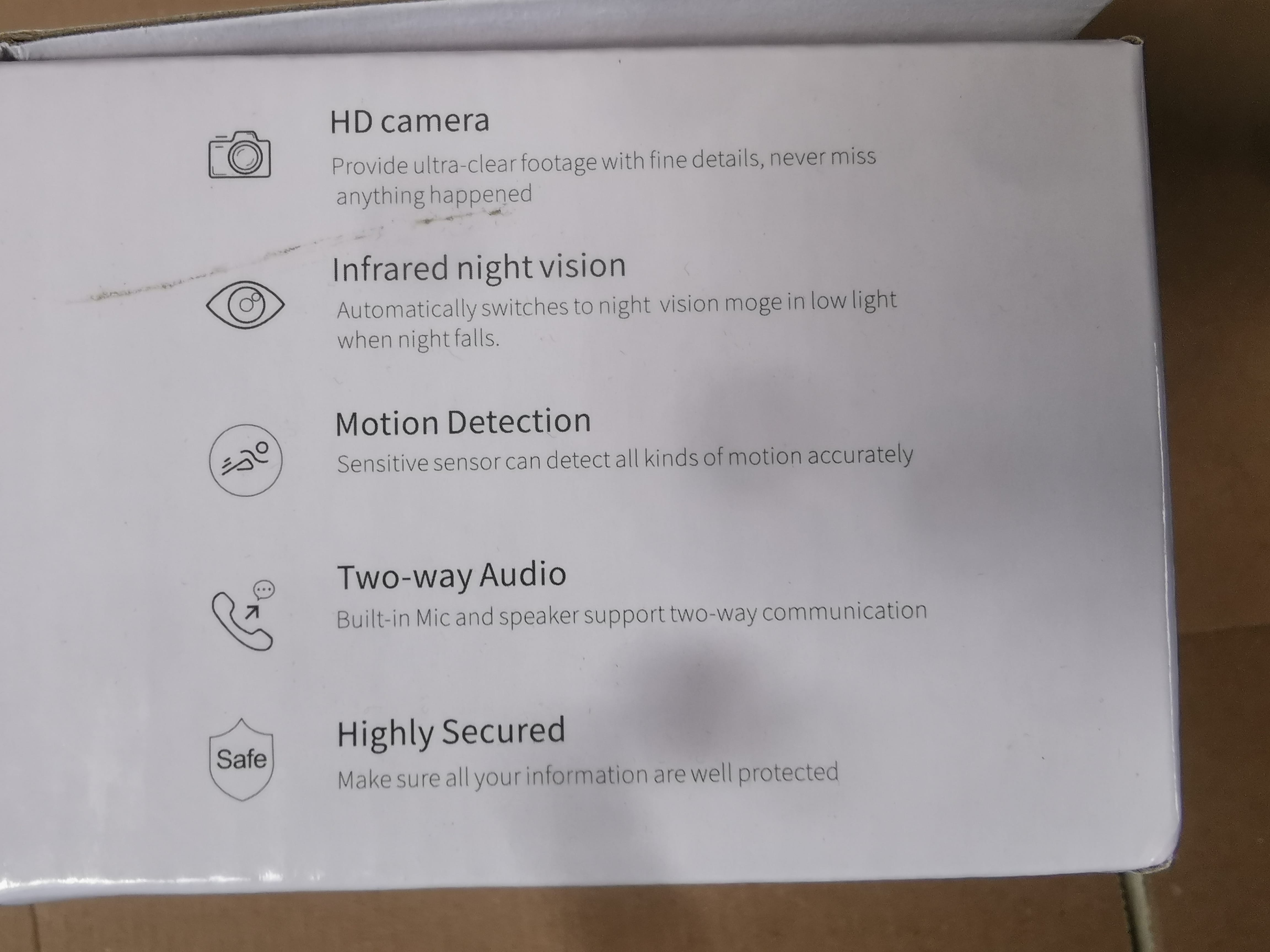 Productbeschrijving: De camera heeft een 2 wegen audio functie, je kan dus horen wat er gebeurd maar ook spreken tegen bijvoorbeeld de pakketbezorger. De camera beschikt over 2 miljoen pixels 1080P high-definition beeldkwaliteit; Infrarood nachtzichtfunctie, wit licht vullicht; draai 355 graden naar links en rechts, 90 graden op en neer; geluid, video, afspelen, alarm en andere functies; Kan aan de muur worden gehangen of op tafel worden geplaatst; USB-power Android-interface, 5V 1.5A voeding; maximale ondersteuning 256G kaart opslag; ondersteuning van cloudopslagdiensten;