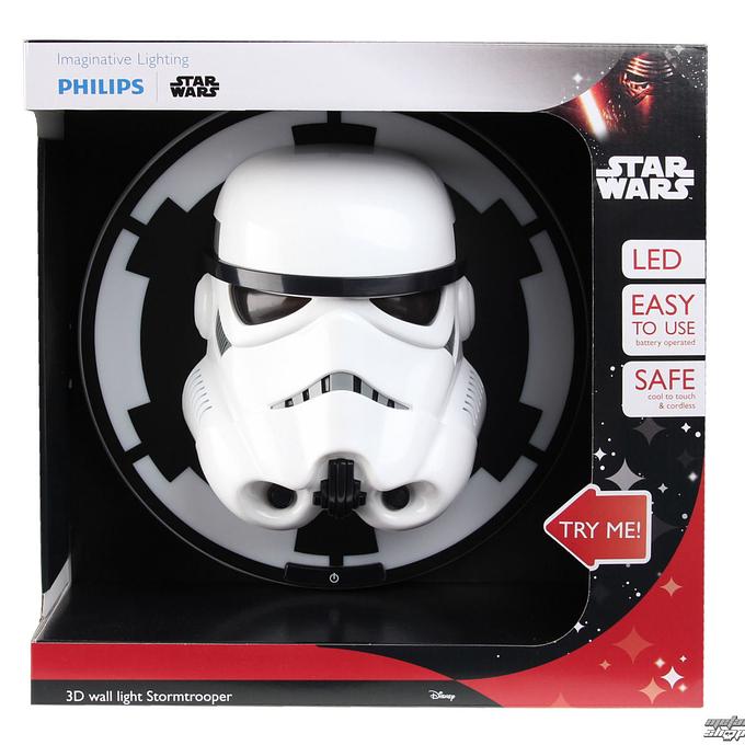 Productbeschrijving: wandlamp met motief uit de film Star Wars - Stormtrooper. Deze decoratie heeft drie modi: 1e) niets is uit 2e) nadat u op de knop hebt gedrukt, gaan beide ogen en de rode buitenring branden 3.) De volgende andere persing gaat alleen uit de buitenste ring en stralende ogen