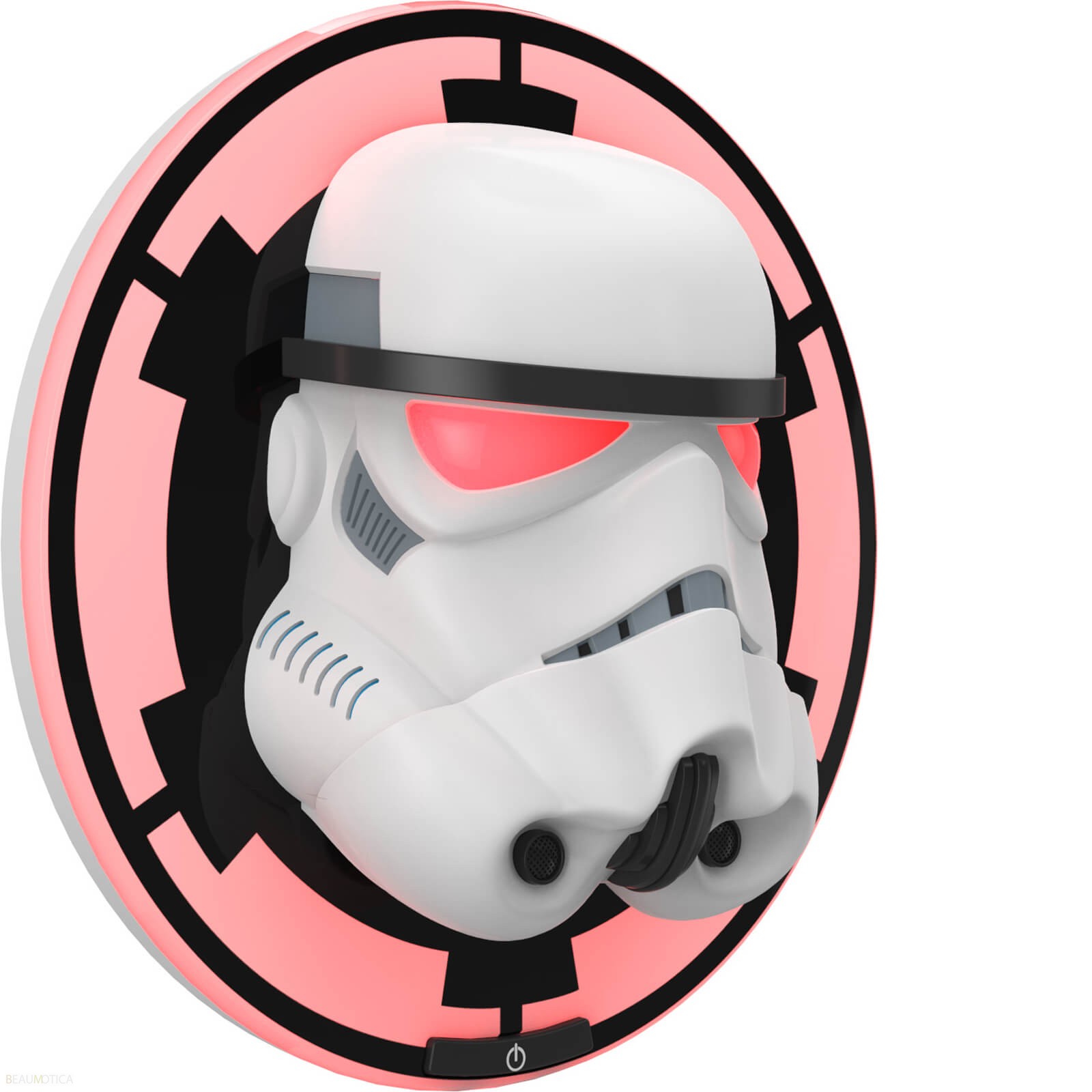 Productbeschrijving: wandlamp met motief uit de film Star Wars - Stormtrooper. Deze decoratie heeft drie modi: 1e) niets is uit 2e) nadat u op de knop hebt gedrukt, gaan beide ogen en de rode buitenring branden 3.) De volgende andere persing gaat alleen uit de buitenste ring en stralende ogen