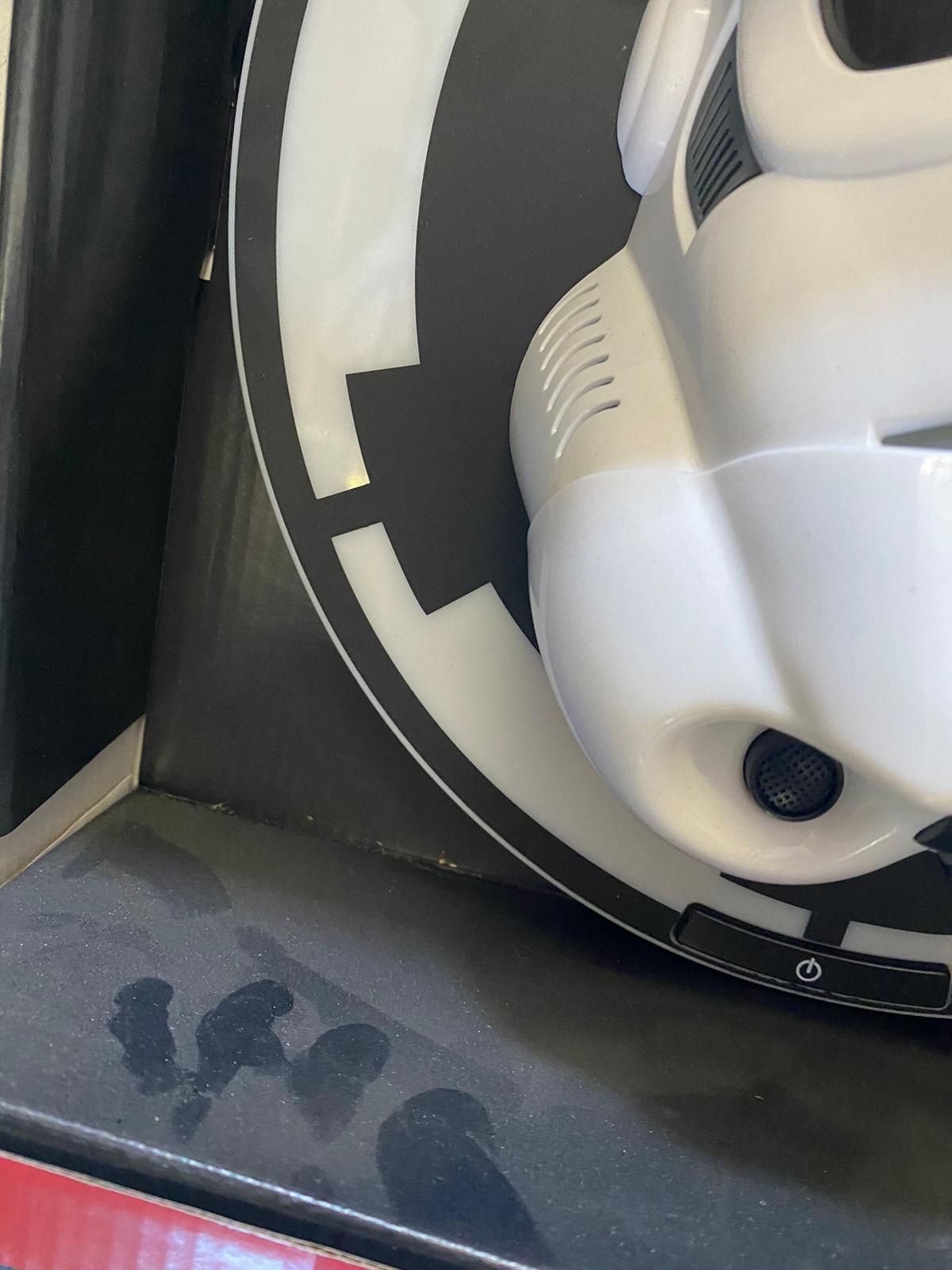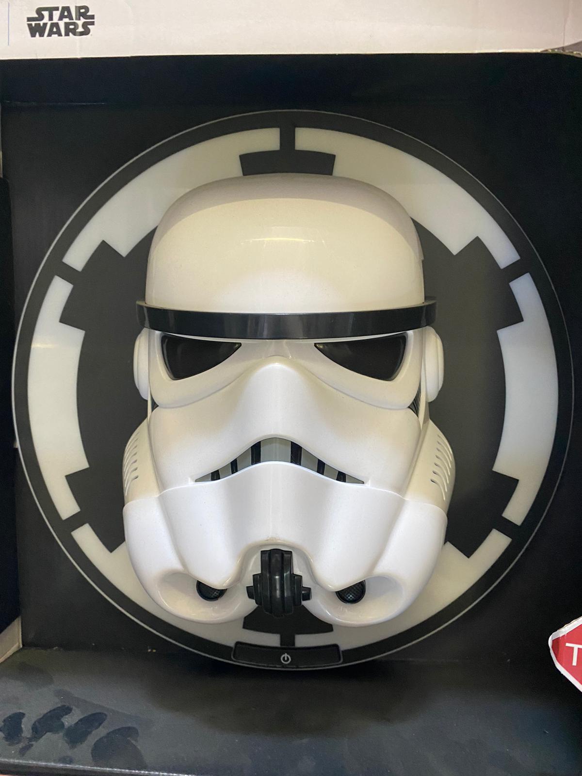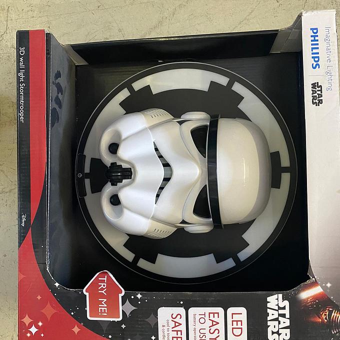 Productbeschrijving: wandlamp met motief uit de film Star Wars - Stormtrooper. Deze decoratie heeft drie modi: 1e) niets is uit 2e) nadat u op de knop hebt gedrukt, gaan beide ogen en de rode buitenring branden 3.) De volgende andere persing gaat alleen uit de buitenste ring en stralende ogen