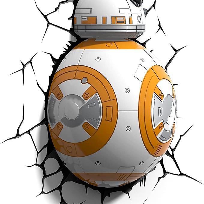 Productbeschrijving: Gelicentieerde 3D Star Wars wandlamp BB-8 te gebruiken als nachtlampje, sfeerlicht, brandt rood Inclusief muurstickers en schroeven, met timerfunctie Draadloze ophanging, vereist 3 x AA-batterijen (niet inbegrepen)