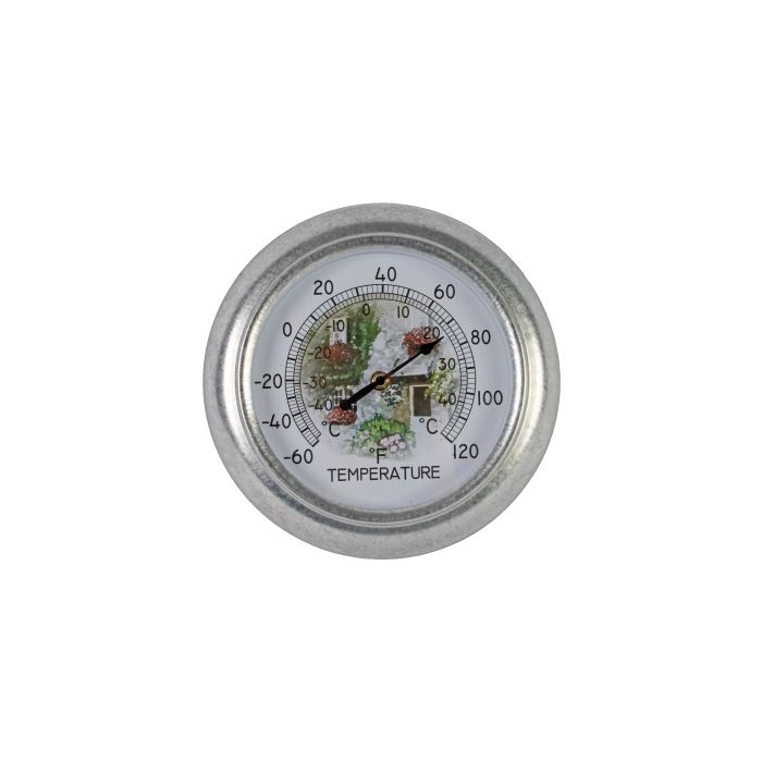 Productbeschrijving: Deze thermometer is gemaakt van metaal. De schaalverdeling is in analoog in graden celcius. Plaats de thermometer op de wand en bevestig het met een schroef. De wijzer wijst naar de actuele temperatuur.
