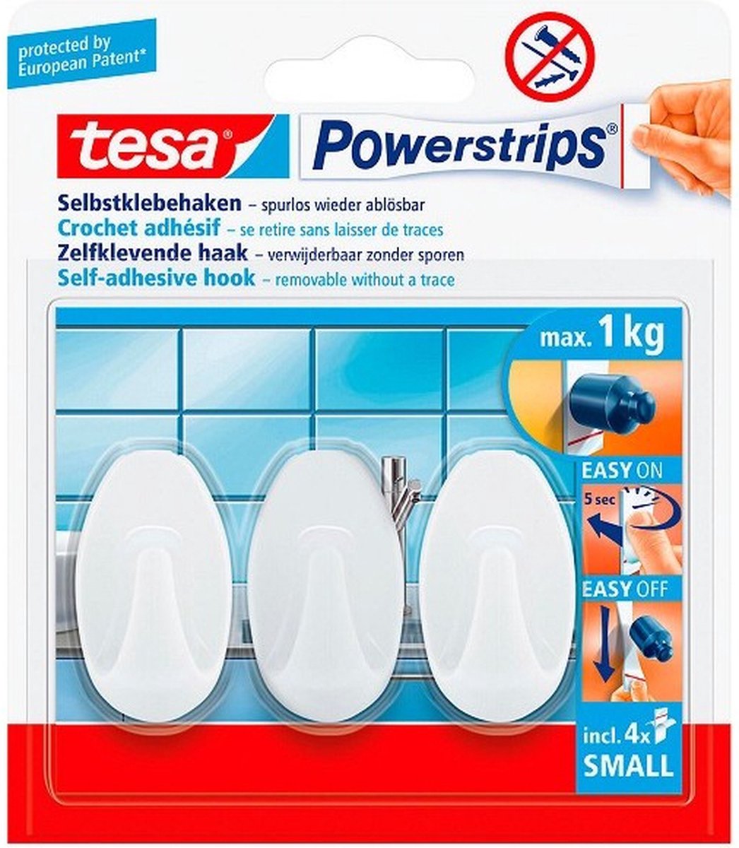 Productbeschrijving: merk Tesa. Ideaal voor een permanente bevestiging van objecten in uw keuken en badkamer of voor een tijdelijke bevestiging van objecten onderweg tijdens de vakantie. De haken zijn makkelijk te monteren zonder boren of schroeven en vervolgens schoon verwijderbaar dankzij de Tesa Powerstrips technologie. De haken zijn aan te brengen op tegels, glas, hout, plastic en andere ondergronden. Monteren: verwijder de folie van de tape, plaats de haak op de gewenste plek en druk ca. 5 sec. goed aan.