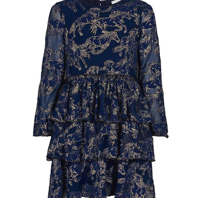 Productbeschrijving: Schattige The New-jurk van marineblauw organza met een all-over paardenpatroon in gouden glitter. De New jurk heeft lange mouwen en opent in de nek met een knoop. In de taille is een elastiek genaaid wat zorgt voor een mooie pasvorm en mooie plooien in de rok. De rok is in drie lagen, wat een prachtig effect geeft. De jurk heeft ook een binnenlaag in een soepel geweven kwaliteit stof, zodat de jurk niet transparant lijkt.