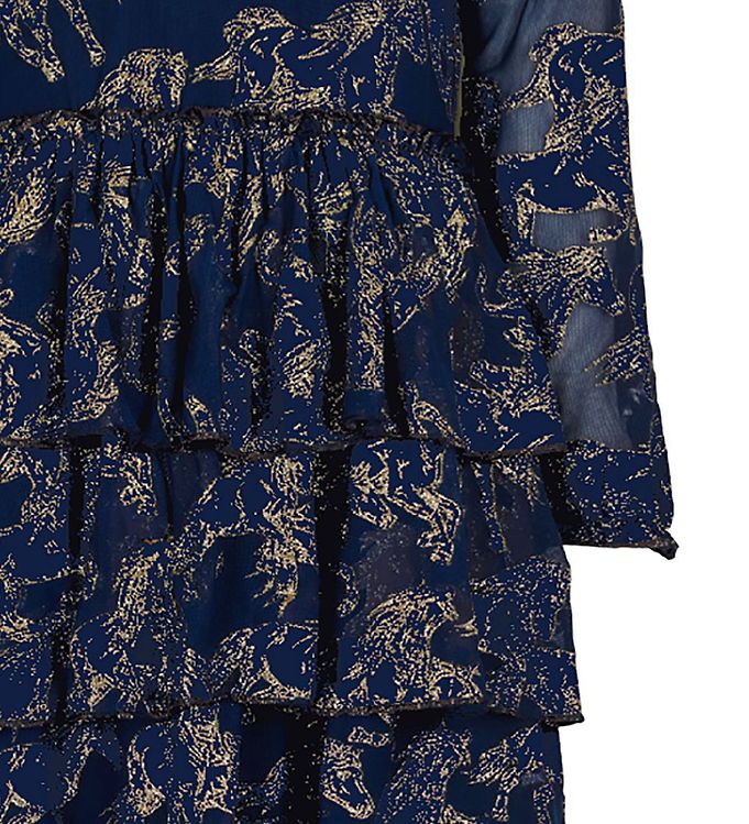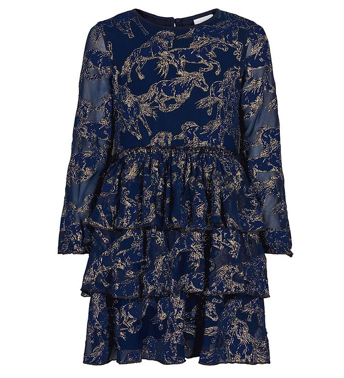 Productbeschrijving: Schattige The New-jurk van marineblauw organza met een all-over paardenpatroon in gouden glitter. De New jurk heeft lange mouwen en opent in de nek met een knoop. In de taille is een elastiek genaaid wat zorgt voor een mooie pasvorm en mooie plooien in de rok. De rok is in drie lagen, wat een prachtig effect geeft. De jurk heeft ook een binnenlaag in een soepel geweven kwaliteit stof, zodat de jurk niet transparant lijkt.
