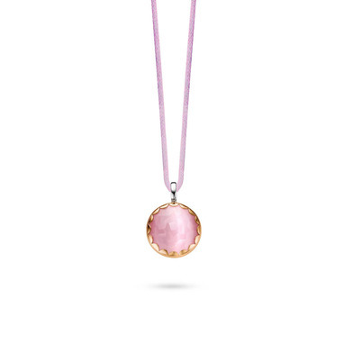 Productbeschrijving: Een mooie zilveren hanger met een roze steen, die is gezet in een sierlijke vergulde rand. Dit sieraad valt geweldig te combineren!