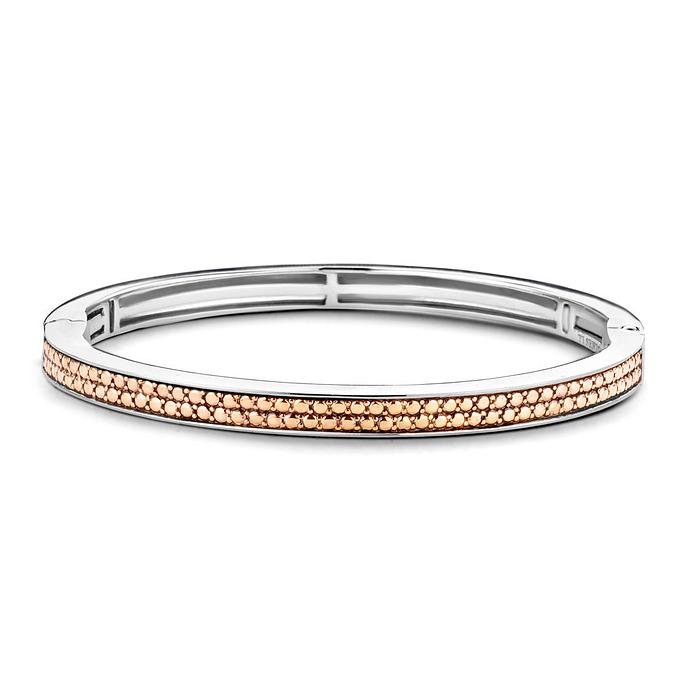 Productbeschrijving: Geïnspireerd op het Italiaanse plattelandsleven met het gevoel van tijd doorbrengen met de familie in een rustieke vertrouwde omgeving. Deze elegante slavenband 2807RD van Ti Sento staat goed om iedere arm. Deze slavenband is geschikt voor dames en is voorzien van een scharnier en slot. De kleur van deze slavenband is zilver en is afgewerkt met een laagje rosé goud. De diameter van de slavenband is 60 mm.