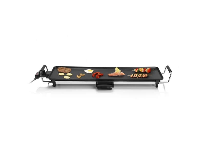 Productbeschrijving: Deze veelzijdige grote Tomado bakplaat 70x23 TM-2455 is uitermate geschikt om vlees, vis, groenten en pannenkoeken op te bereiden. Voorzien van een antiaanbaklaag, affalsembaar snoer met regelbare thermostaat en een vetopvangbak.