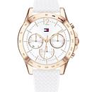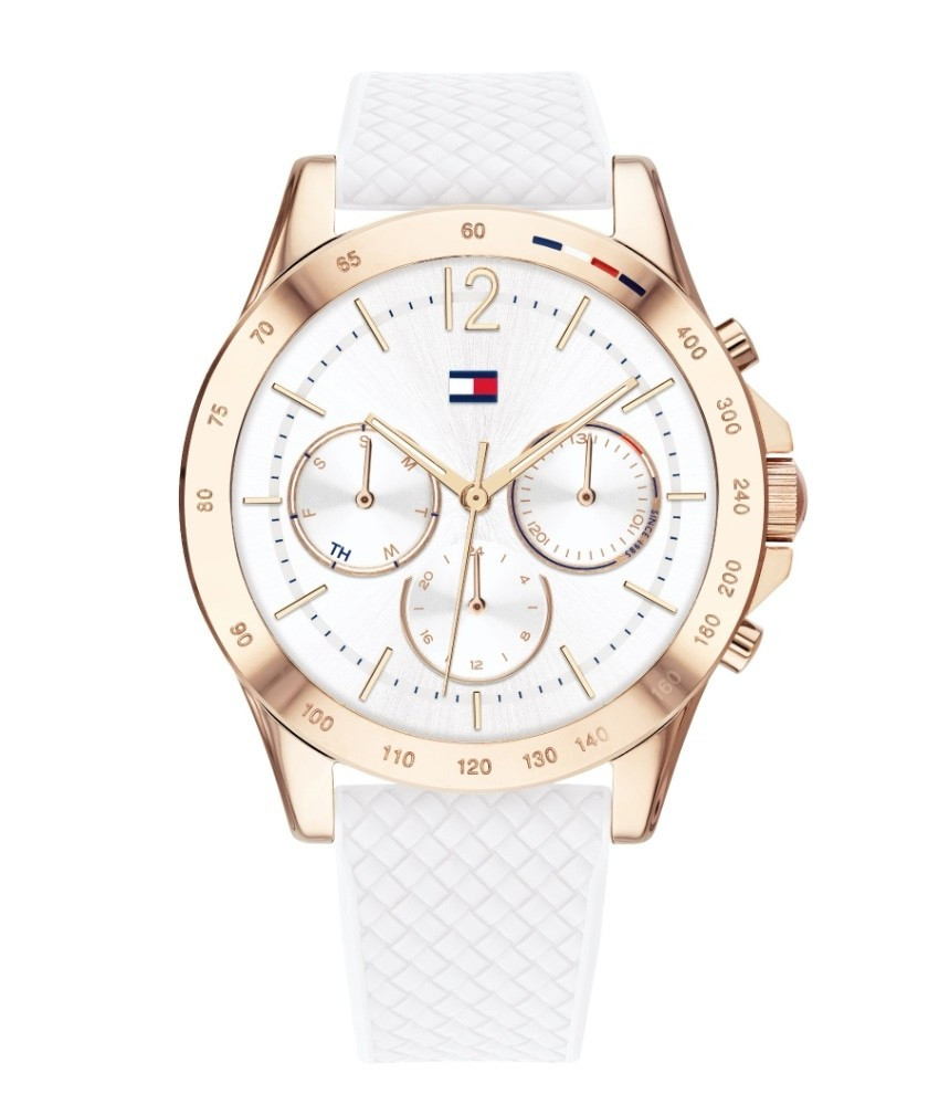 Productbeschrijving: Dit is een horloge van edelstaal PVD rosé. De band van dit Tommy Hilfiger dameshorloge is gemaakt van kwalitatief goed wit siliconen. Dit model heeft een quartz uurwerk, waarop de tijd analoog wordt getoond. De Tommy Hilfiger TH1782199 heeft met 38 mm. een mooi formaat en wordt afgemaakt met een wit gekleurde wijzerplaat. Het materiaal glas van dit uurwerk is mineraal glas, en het horloge is 3 ATM (handen wassen) waterdicht.