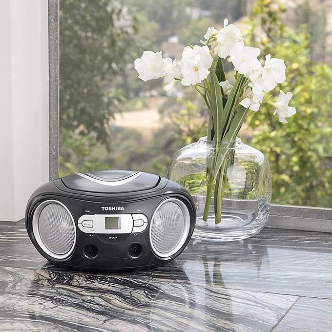 Productbeschrijving: Toshiba presenteert een top-loading cd-speler-boombox met een ingebouwde AM / FM-radiotuner. Speel uw favoriete muziek- en audiobestanden af vanaf de cd-speler. De telescopische FM-antenne zorgt voor een duidelijkere ontvangst en de krachtige stereoluidsprekers vullen uw huis met dynamische audio. De speaker is ook uitermate geschikt voor buitengebruik. In de tuin of op de werkplaats zijn prima plekken. De aantrekkelijke buitenkant geeft elke kamer een stijlvol tintje. En met het gemakkelijk te lezen LCD-paneel kunt u de cd-bedieningselementen snel lokaliseren, zelfs in het donker.