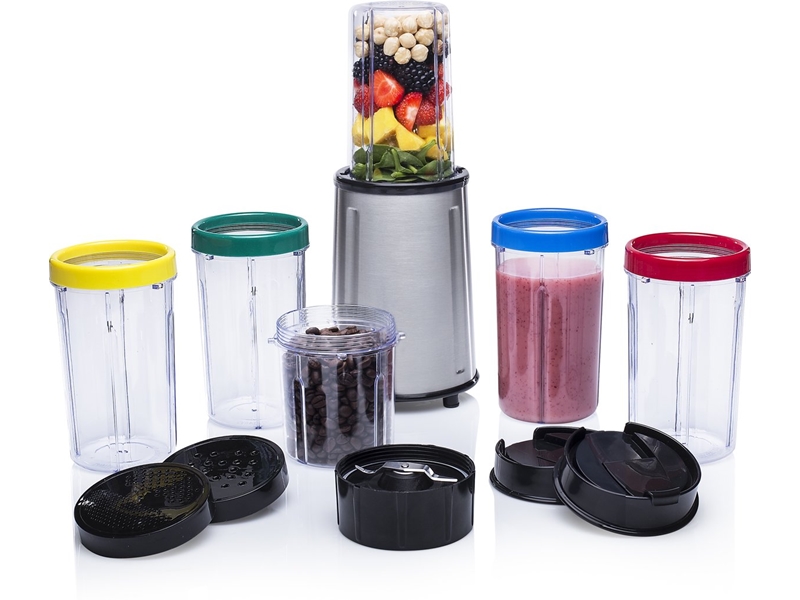 Productbeschrijving: Met de zeer praktische Tristar BL-4445 17-delige Blender set bereid je de heerlijkste smoothies. Ideaal om met de bijgeleverde 6 bekers, 4 drinkringen en 4 deksels een shake dieet te volgen. De roestvrij stalen bullet blender heeft met een vermogen van 240 Watt in no time een vitamine rijke shot voor je klaar staan. De blender is voorzien van een RVS 4-bladig maal mes en een RVS 2-bladig mix mes. Daarmee is het uitermate geschikt voor zowel natte als droge ingrediënten. Begin zo je dag met een vitamine bom of een zalig kopje koffie van versgemalen koffiebonen. Letter en figuurlijk heb je in een handomdraai een verse smoothie of een heerlijke saus voor je neus. Plaats de beker op het apparaat, creëer je gewenste mix en vervang vervolgens voor direct gebruik de messendop door 1 van de 4 kleurrijke drinkringen of praktische deksels. Met de BPA vrije kunststof beker voorkom je inname van de schadelijke stof Bisfenol. Daarnaast perfect geschikt om hete supplementen toe te voegen. Gebruik de 2 stoomuitlaat deksels voor hemelse sauzen of smaakvolle soepen en de 2 strooideksels voor geraspte kaas of gemalen kruiden. Na het blenden van jouw favoriete ingrediënten met behulp van de Tristar BL-4445 Blender is het schoonmaken geen probleem. De losse onderdelen zijn namelijk vaatwasmachinebestendig.