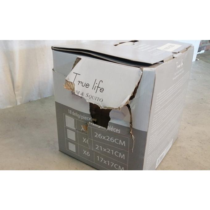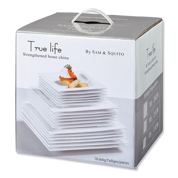 Productbeschrijving: Haal moderne en stijlvolle borden in huis met deze 18-delig True Life serviesset, bestaande uit 3 x 6 vierkante borden van verschillende formaten. De set bevat 6 diner-, 6 ontbijt- en 6 gebaksborden van porselein.