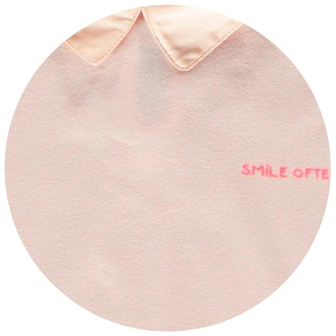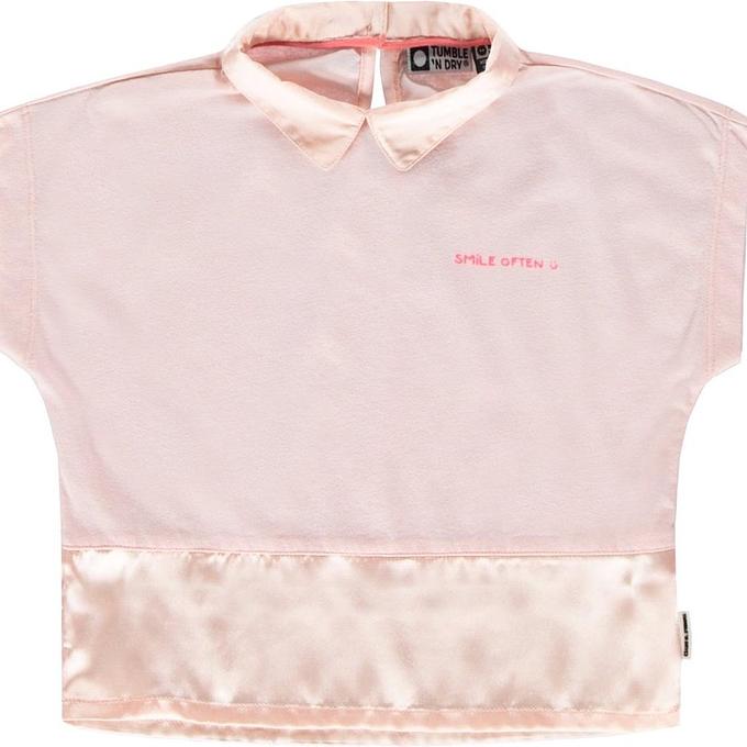 Productbeschrijving: Shiny happy girls! In deze korte-mouwen-top met glimmend kraagje, onderrand en 'Smile often'-print op de borst stralen alle meisjes. Dat is ook te danken aan het zachte katoenen middenstuk, het girly lichtroze, de oogjessluiting op de rug en de stijlvolle kraag voor én achter. Rokje eronder voor nóg meer stijl of jeans voor een 'casual chic' effect. T'ND meisjes-must-have!
