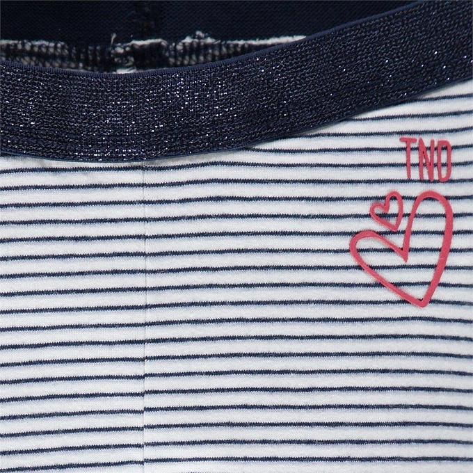 Productbeschrijving: Classic 2.0! Een blauw-wit gestreepte legging hoort in elke meisjesgarderobe thuis. Deze scoort dubbele punten vanwege het ultrazachte katoen, de aansluitende pasvorm, het T'ND hartje op de heup en de elastische tailleband met subtiele glitters.
