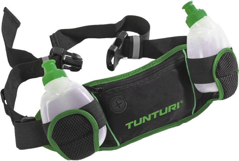 Productbeschrijving: De Tunturi Running Belt is een hardloopset die je om je middel draagt. Deze riem"" heeft 2 170 ml drinkflesjes om water of sportdrank mee te nemen tijdens het hardlopen. Aan de voorkant zit een vak met ritssluiting om overige spullen mee te nemen. Een MP3 speler bijvoorbeeld. Er zit een speciaal gat in het vak waar je het snoer van een koptelefoon doorheen kunt halen. De Tunturi running belt is licht genoeg om niet in de weg te zitten tijdens het hardlopen. De running belt maak je vast met een clip op je rug.