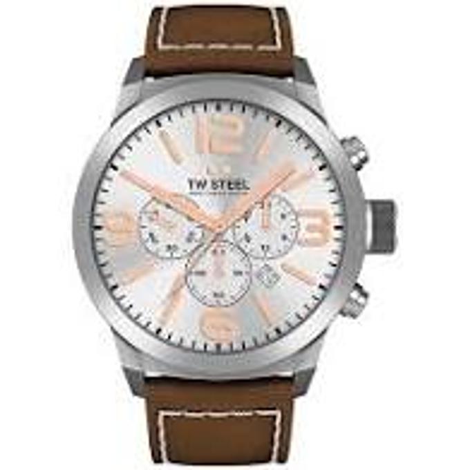 Productbeschrijving: Dit TW Steel "Marc Coblen Edition" TWMC11 horloge heeft een 42 mm brede 316L extra hard roestvrijstalen kast en een stralend zilverwitte wijzerplaat met rosegoudkleurige cijfers en wijzers. Het horloge heeft een chronograaf (stopwatch) en tweede 24 uurs tijdsaanduiding.