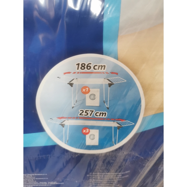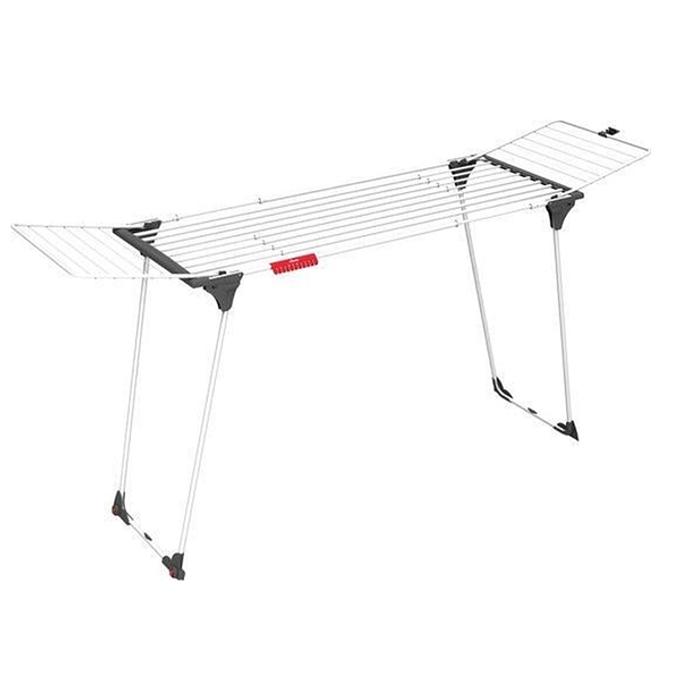 Productbeschrijving: De Infinity van Vileda is een uitschuifbaar stalen droogrek met een maximale droogcapaciteit van 27m. Ideaal voor lakens en tafellakens door de droogcapaciteit van het middenstuk te verlengen van 1,86m tot 2,57m. Met zijn zijvleugels past u de droogcapaciteit aan in functie van uw behoeften. Ook ondergoed en sokken hangt u gemakkelijk te drogen aan de houder voor kleine stukken. Zijn dikke centrale draden laten weinig plooien achter op uw wasgoed, waardoor u daarna minder tijd verliest met het strijken ervan. Zijn parallelle, stalen poten bieden u meer stabiliteit en duurzaamheid; hun speciale scharnieren voorkomen per ongeluk dichtklappen, zelfs tijdens het verplaatsen.