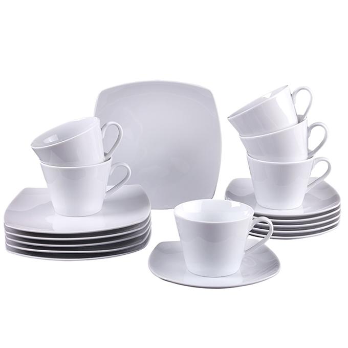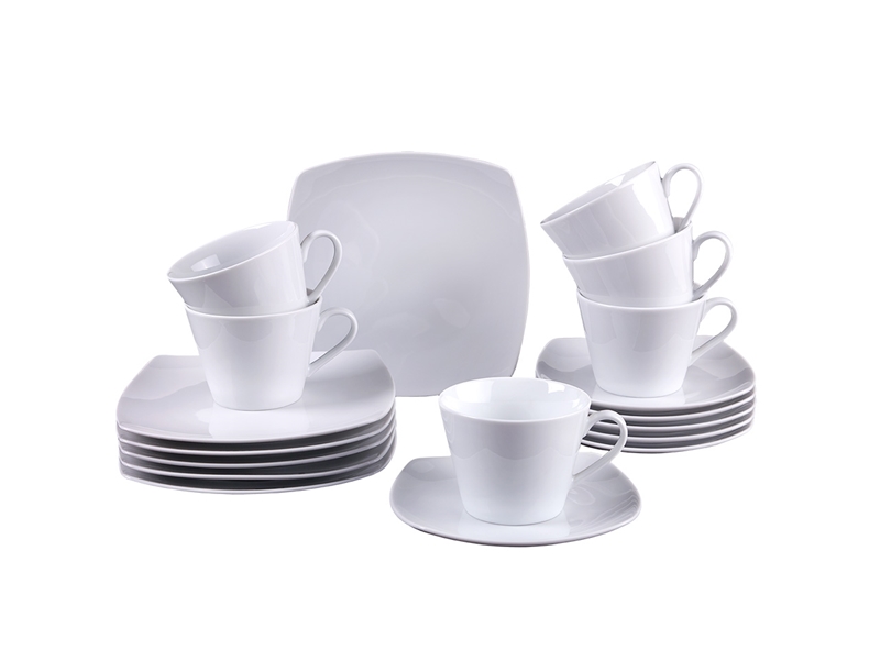 Bestaande uit: 6 koppen 25cl, 6 schotels 16x16cm, 6 platte borden, 19,5x19,5cm