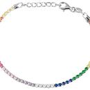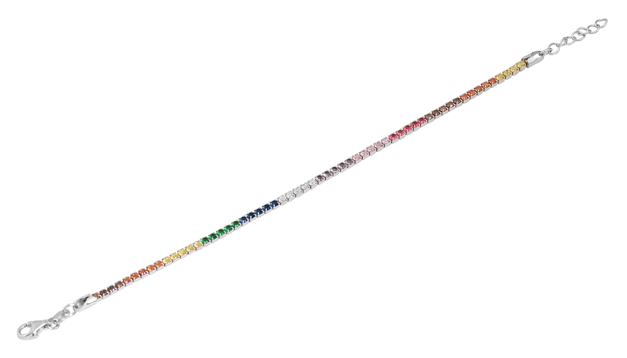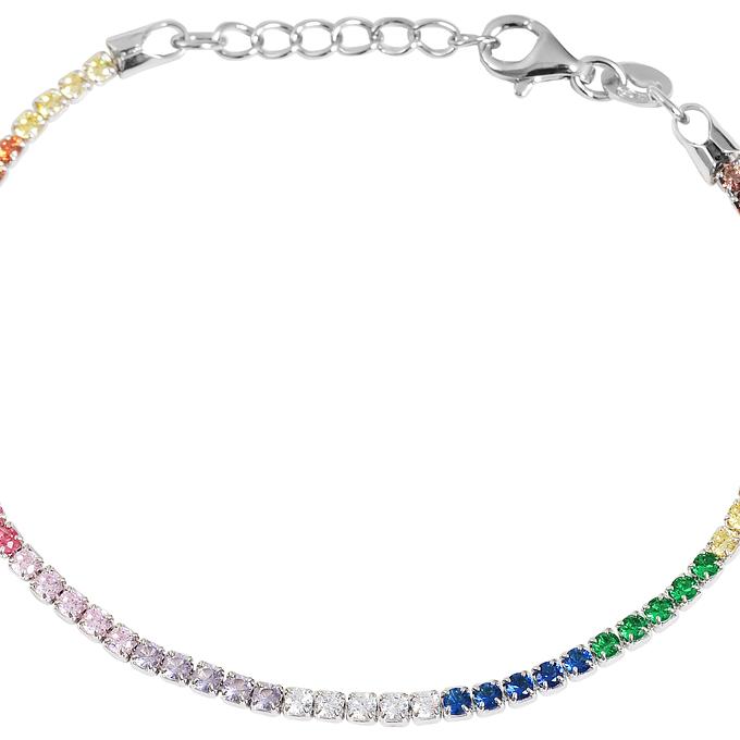 Productbeschrijving: De stijlvolle zilveren armband van 925 zilver is gerhodineerd en heeft een lengte van 17 + 3 cm, een gewicht van 4 gram en de kettingdikte is 22 mm. De armband is versierd met 58 gekleurde zirkonia steentjes. De armband is te sluiten met een karabijnsluiting.